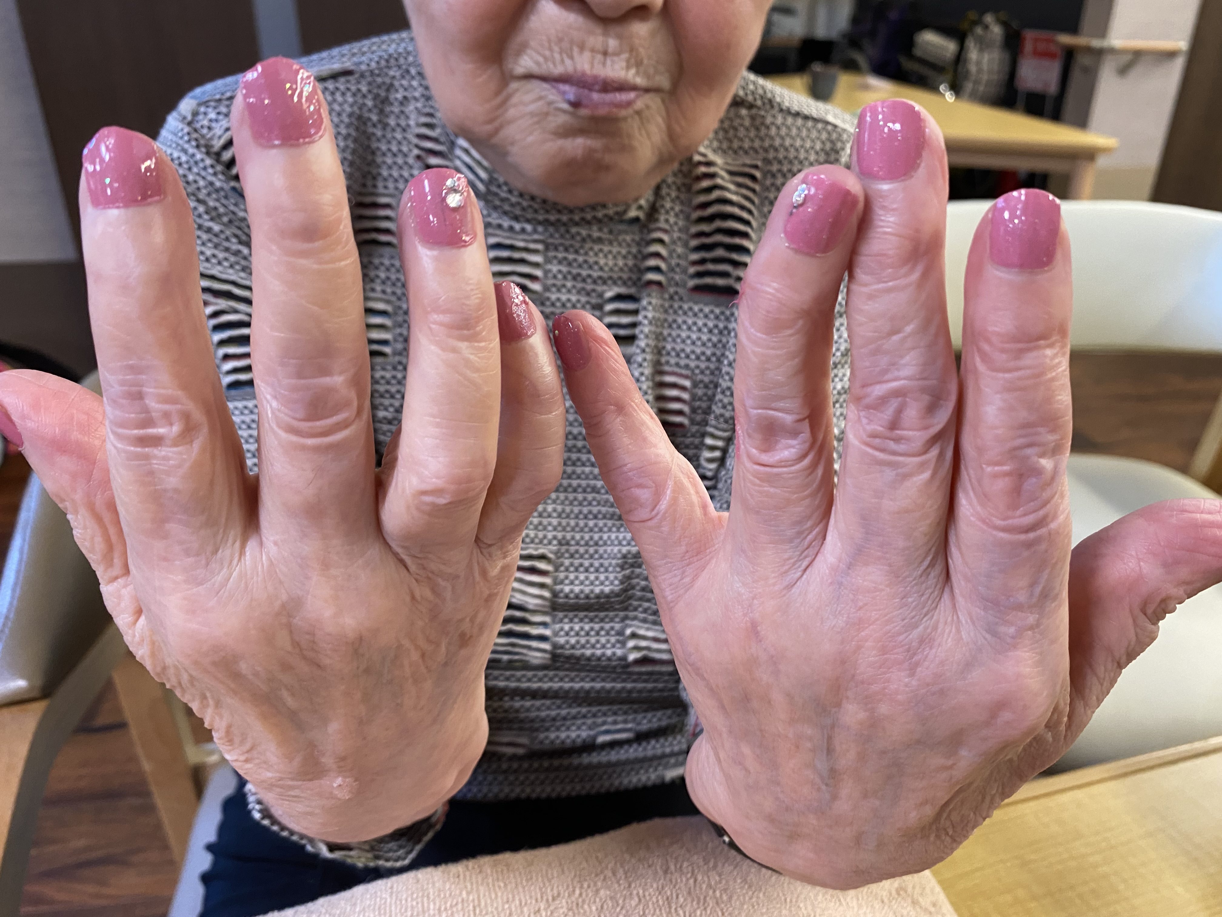 小さな手で利用者さんの爪にネイルを一緒につけてくれました😊